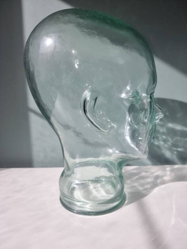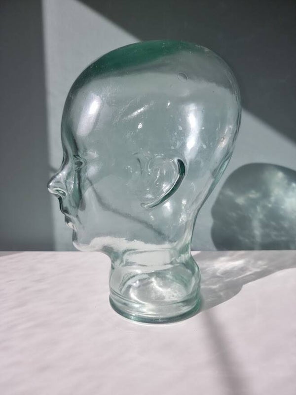 Vintage glazen mannequin hoofd. Deze items werden populair in de jaren '60 en '70 en worden vaak gebruikt als decoratie of als display voor hoeden, pruiken of koptelefoons.