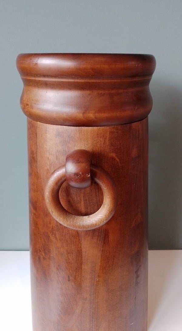 Vintage houten paraplubak vervaardigd in de stijl van de jaren '60 of '70. Hoewel het de vorm van een vaas heeft, wordt het object met name geïdentificeerd als een paraplustandaard vanwege de specifieke vorm en de ringvormige handvatten.